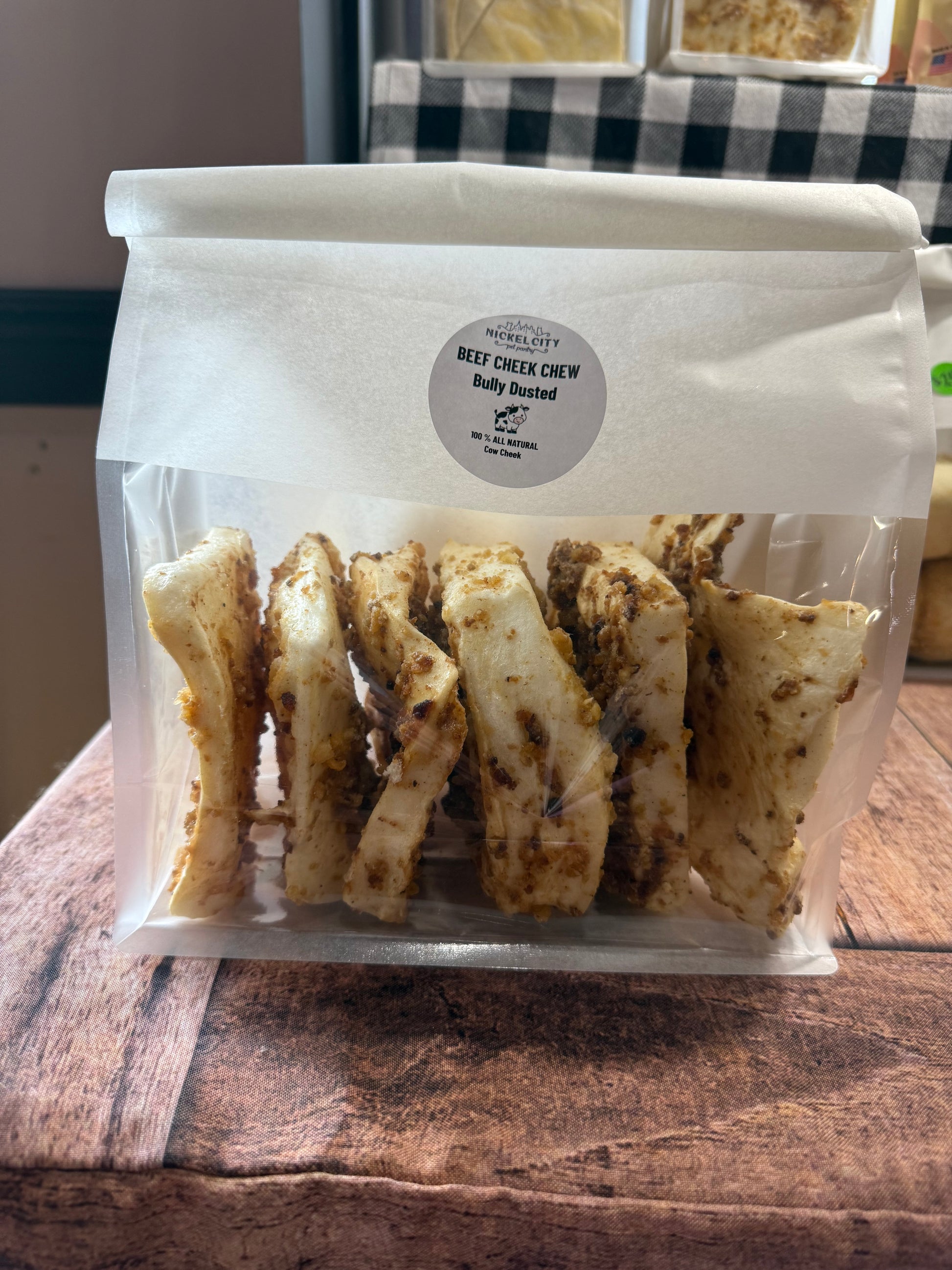 100% natural Beef Cheek Chips look like rawhide, but are much more digestible. These are approximately 4”x 4” but size and thickness will vary. These are appropriate for puppies and small dogs. Available in plain, bully-coated, or peanut butter.
